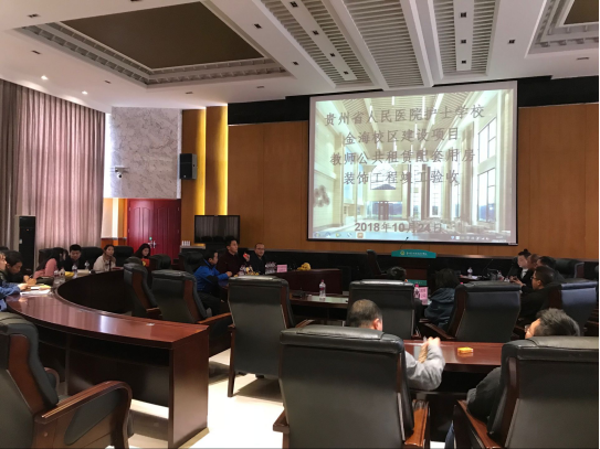 2018年10月24日下午2时,贵州护理职业技术学院金海校区建设项目4、5号楼公共租赁配套用房装饰工程在学术报告厅召开验收会议。贵阳建筑勘察设计有限公司设计师徐娟、梁任,贵州众益建设监理咨询有限公司项目部总监理工程师代表耿林康、监理员王洪国、王忆,贵州护理职业技术学院总务科科长詹沛晶、项目部副主任胡从新、葛永富、项目部成员徐一鑫、詹崇天、吴林容、顾瑞峰、曾上玲、王俐钦,贵州建工集团第十一建筑工程有限责任公司总经理温廷军、项目经理助理陈鑫烨、工作人员郭怀、王媛参加了会议。