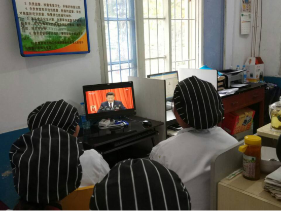 学校食堂员工正在观看十九大开幕式