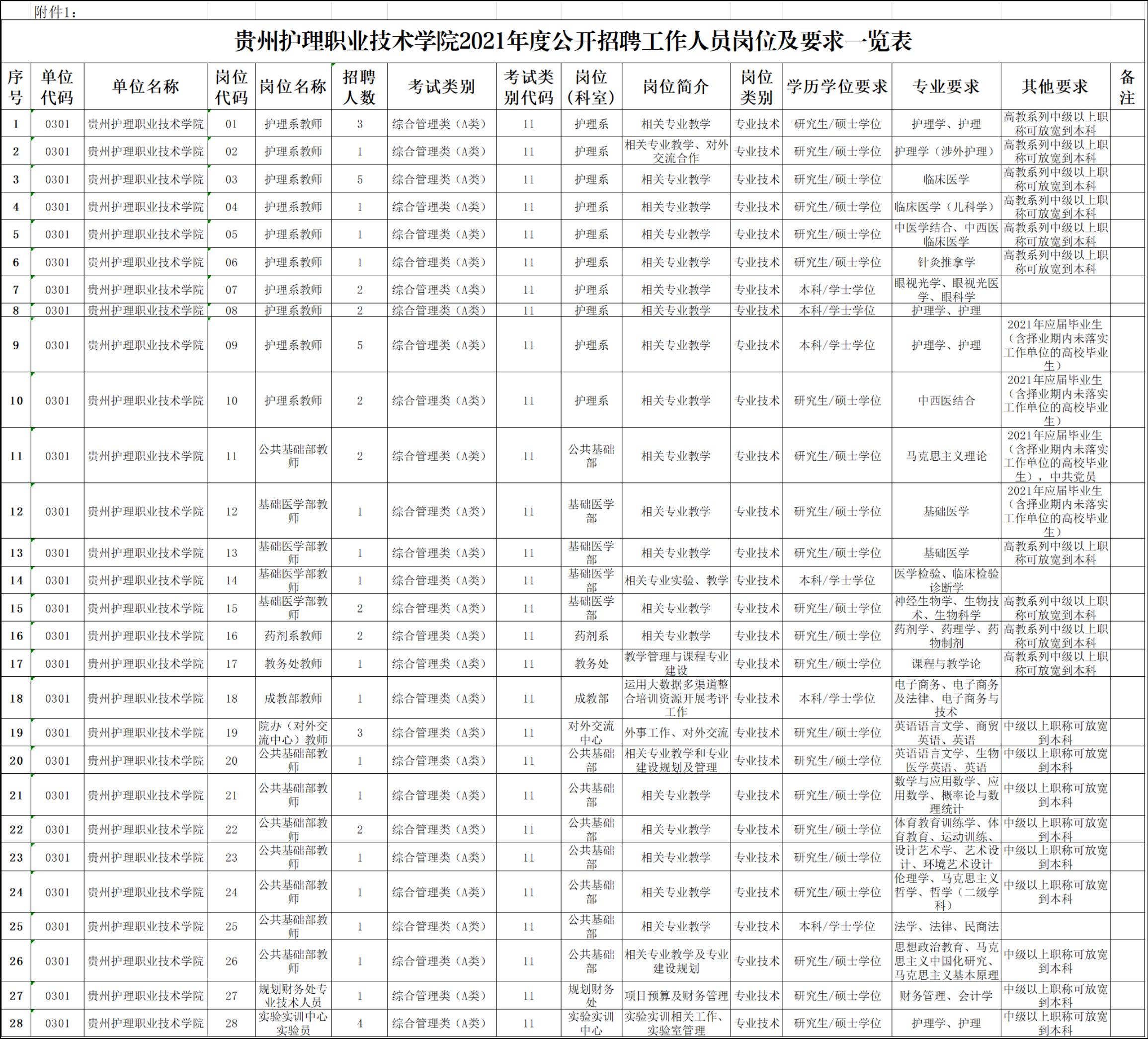 具体招聘岗位及要求见《贵州护理职业技术学院2021年度公开招聘工作人员岗位及要求一览表》(附件1)。