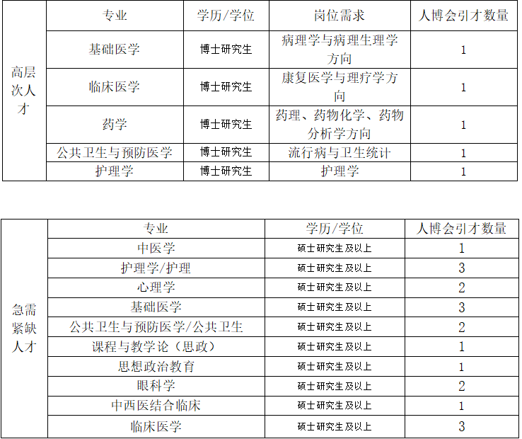 根据省人力资源和社会保障厅《关于做好事业单位2021年贵州人才博览会暨赴知名高校引才有关工作的通知》精神,结合学院实际岗位人才需求情况,经省卫健委和省人社厅审批通过,我院拟引进高层次和急需紧缺人才共15个岗位24人,具体如下: