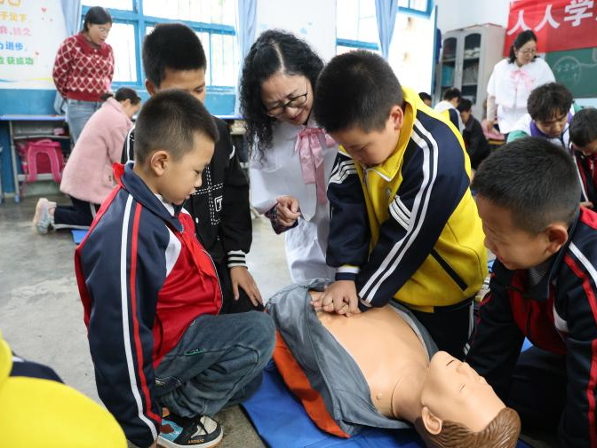 在龙场小学,为进一步加强乡村健康科普教育和健康促进工作,有效将急救知识、安全知识和健康知识推广覆盖到更多群体,营造“人人学急救,急救为人人”的良好社会氛围,助力乡村振兴,学院教师及学生代表走进教室。他们运用通俗易懂的语言,结合常见的案例,为龙场小学学生详细讲解了“海姆立克急救法”和“心肺复苏术”产生背景、使用场景、操作方法及注意事项等,并邀请小学生们进行现场模拟操作,手把手进行指导,激发了小学生们浓厚的学习兴趣。