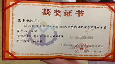 夏雨歌同学是我院中职护理专业2017级学生,在今年4月举办的2019年贵州省职业院校护理技能大赛暨全国职业院校护理技能大赛选拔赛中,她以扎实、娴熟的护理理论知识和实操技术获得中职组一等奖的好成绩,并由此获得代表贵州省参加2019年全国职业院校技能大赛中职组护理技能赛项比赛的机会。在随后的两个月中,我院指导教师张莉莉、朱虹帮助备战选手充分吸取贵州省技能大赛中的经验,对照评审专家提出的不足和改进意见,有针对性地从理论知识、操作技术、心理素质等方面着手,进行了系统、深入、细致的训练,为我院选手在本次全国技能大赛中获奖奠定了扎实的基础。