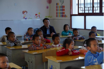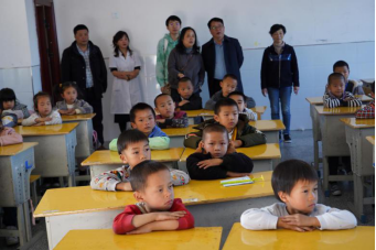 学生志愿者为孩子们检查视力