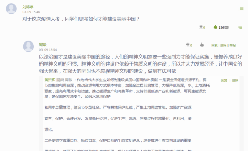 “疫情防控思政大课”直播在师生中间引起热烈反响。他们认真做笔记、积极发表自己的感想。四位教授精彩的授课令同学们受益匪浅,学生们纷纷留言,发表自己的观点
