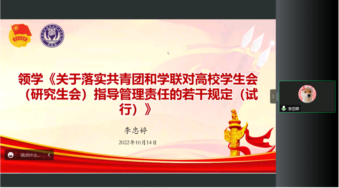 会议第四项:李忠婷老师领学《关于落实共青团和学联对高校学生会(研究生会)指导管理责任的若干规定(试行)》
