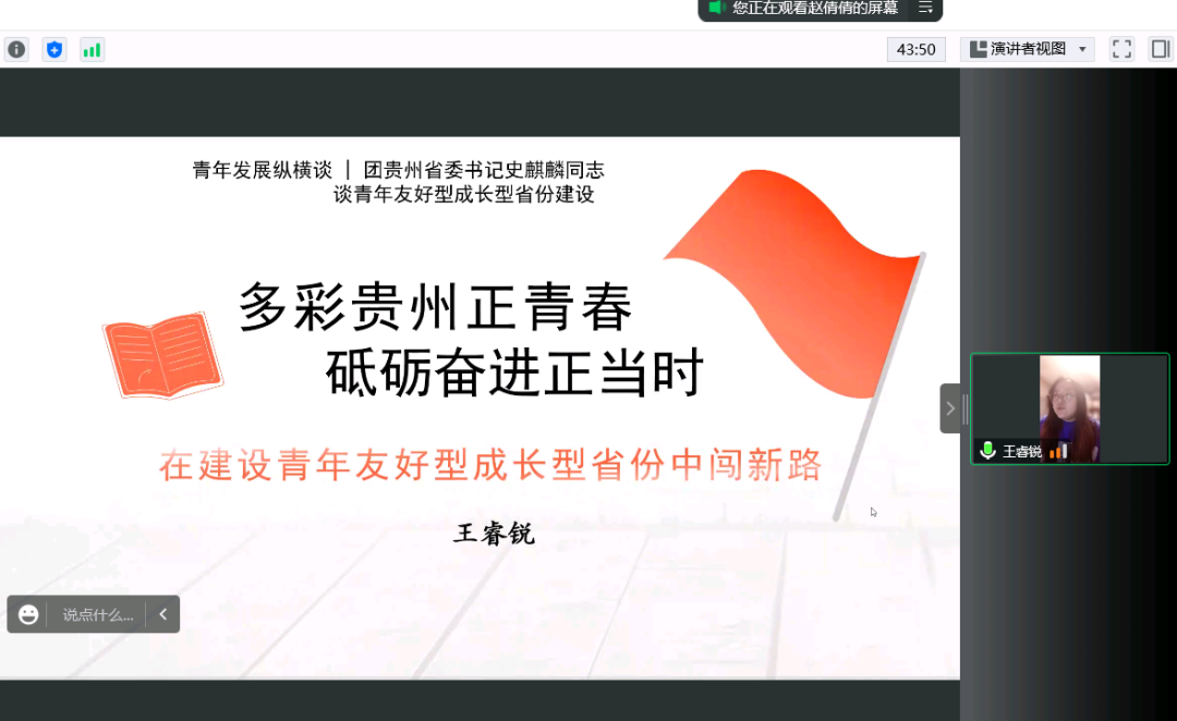 会议第三项:王睿锐老师领学,青年发展纵横谈|团贵州省委书记史麒麟同志谈青年友好型成长型省份建设,“多彩贵州正青春砥砺奋进正当时”在建设青年友好型成长型省份中闯新路