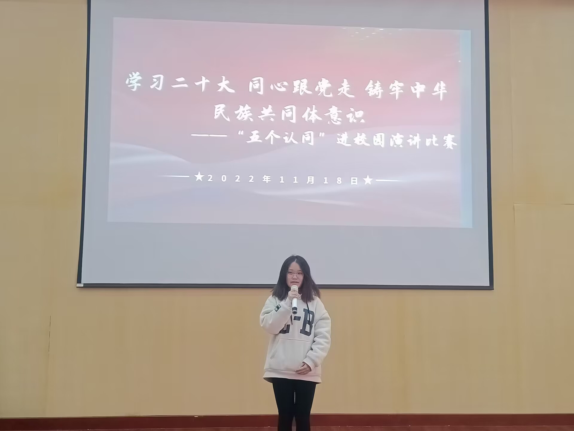 为深入学习党的二十大精神,进一步贯彻落实中央、省委、州委民族工作会议精神,扎实推进我州创建铸牢中华民族共同体意识模范州工作,引导我院学子铸牢中华民族共同体意识和增强对伟大祖国、中华民族、中华文化、中国共产党、中国特色社会主义的认同,牢固树立正确的祖国观、历史观、民族观,为学习贯彻党的二十大精神营造良好社会氛围,根据黔南统通【2022】33号文件,我院于11月18日下午在我院知行楼音乐厅开展了学习党的二十大 同心跟党走 铸牢中华民族共同体意识——“五个认同”进校园演讲比赛。