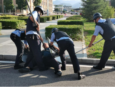 现场模拟演练“与持械歹徒进行盾刀实战对抗技巧”,从发现歹徒到组织力量进行处置到制服歹徒,整个过程仅仅用了3分钟的时间。